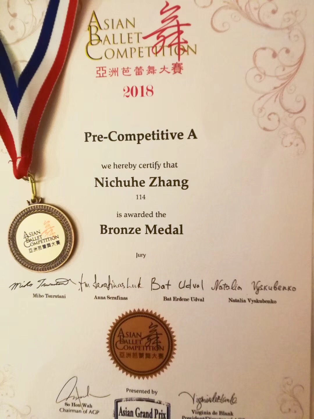 金芭蕾舞蹈小学员张尼楚贺在刚刚结束的ABC亚洲芭蕾舞大赛中荣获Pre-A组铜奖,短短三个月、第一次学变奏、第一次参加比赛,就拿到2块铜奖,太为你骄傲了。感谢你的努力、爸爸妈妈的支持、和你外表平静确内心坚定的小性格!一周两赛,两个铜奖对8岁的你来说已经很棒了,芭蕾的路还很长,老师愿意与你一起成长!金芭蕾舞蹈愿意与你一起成长,加油!
